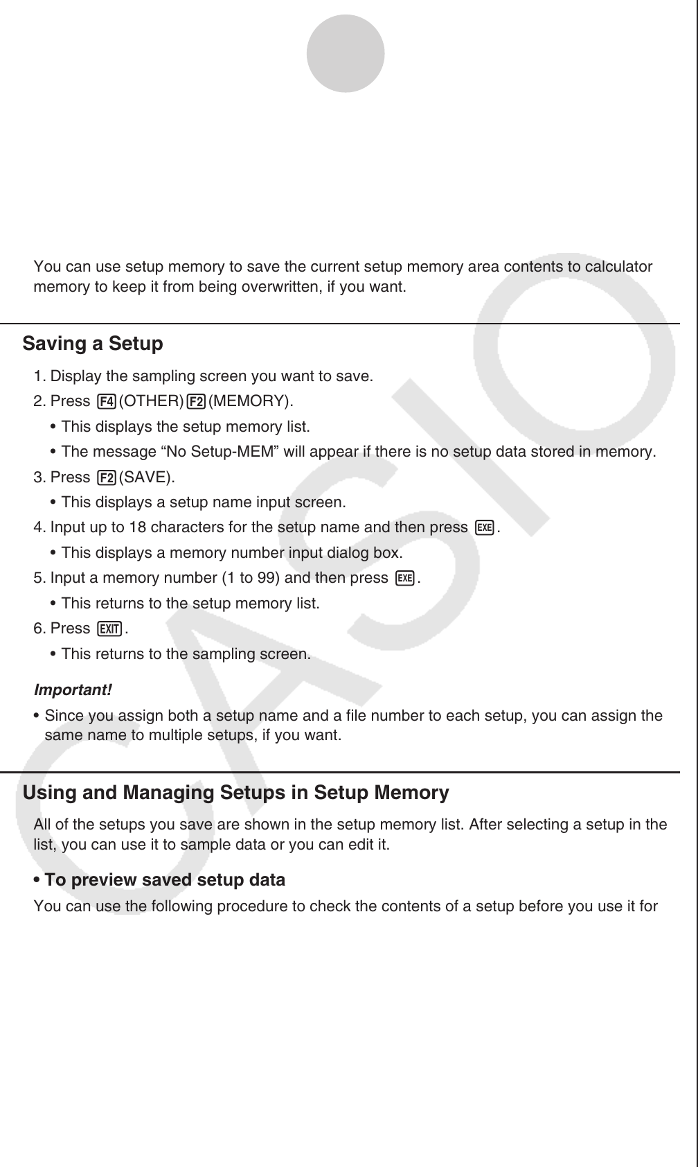 setup) is stored at the time it is created in a memory area called the “current setup memory
