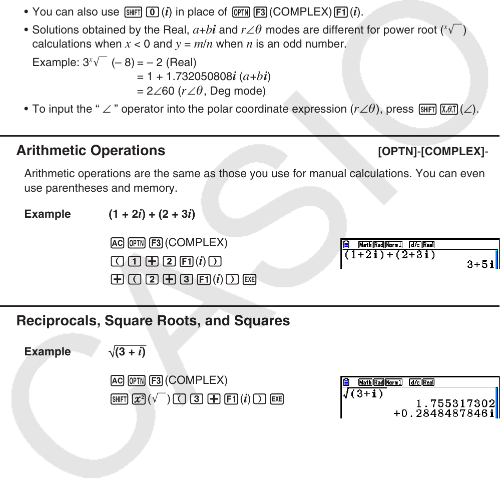 k Arithmetic Operations [OPTN] - [COMPLEX] - [ i ]