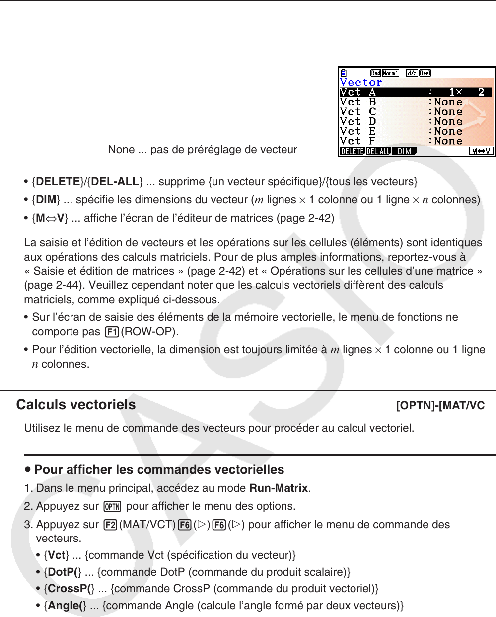 k Calculs vectoriels [OPTN]-[MAT/VCT]