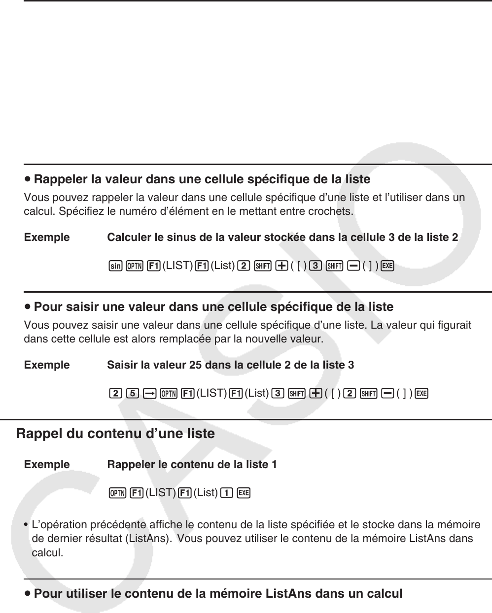 • L’opération  K1(LIST) 1(List) !-(Ans) rappelle le contenu de la mémoire ListAns.