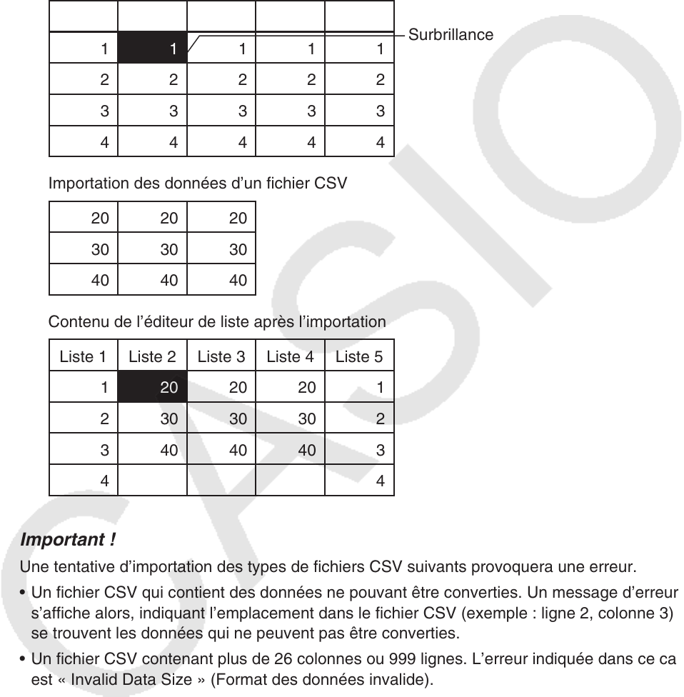 Une tentative d’importation des types de fichiers CSV suivants provoquera une erreur.
