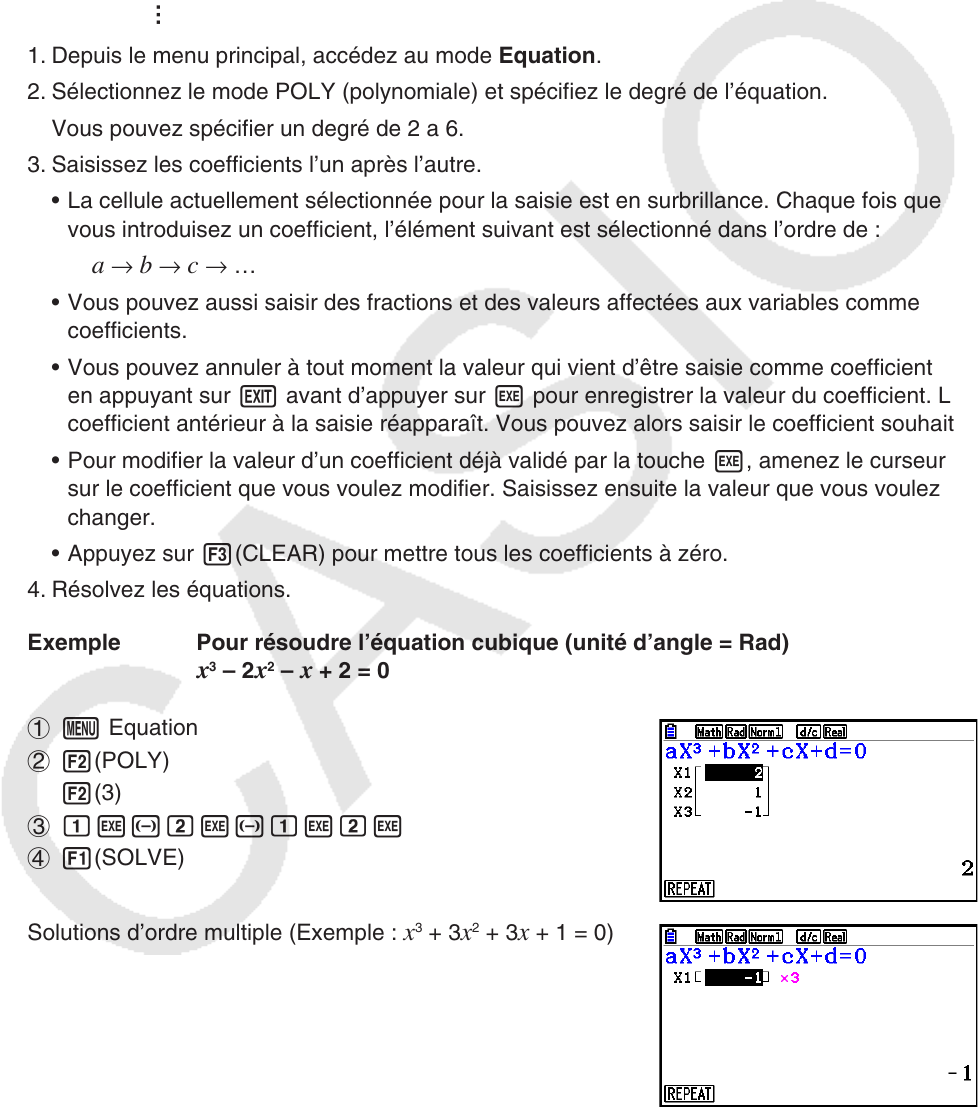 Exemple Pour résoudre l’équation cubique (unité d’angle = Rad)