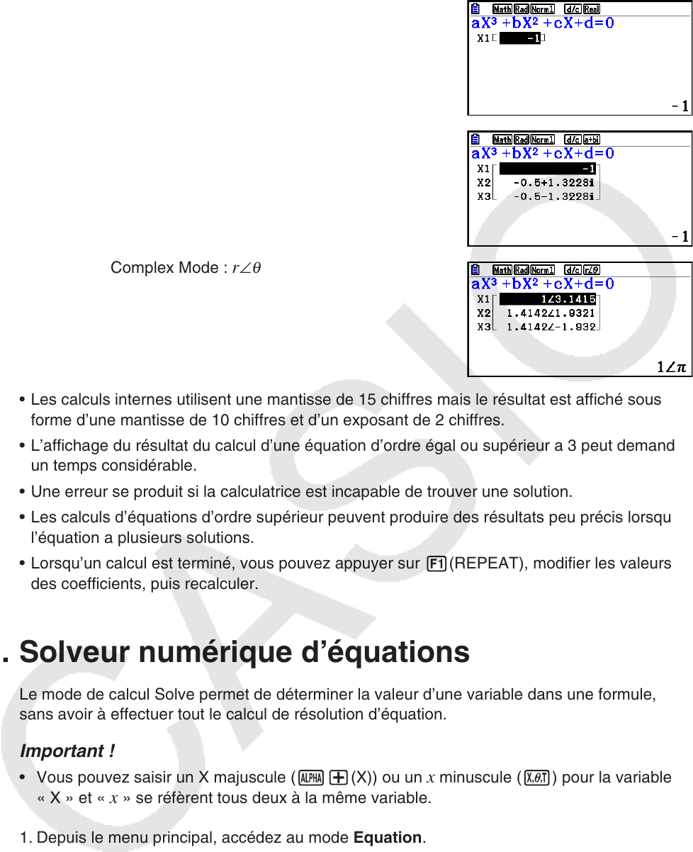 • L’affichage du résultat du calcul d’une équation d’ordre égal ou supérieur a 3 peut demander