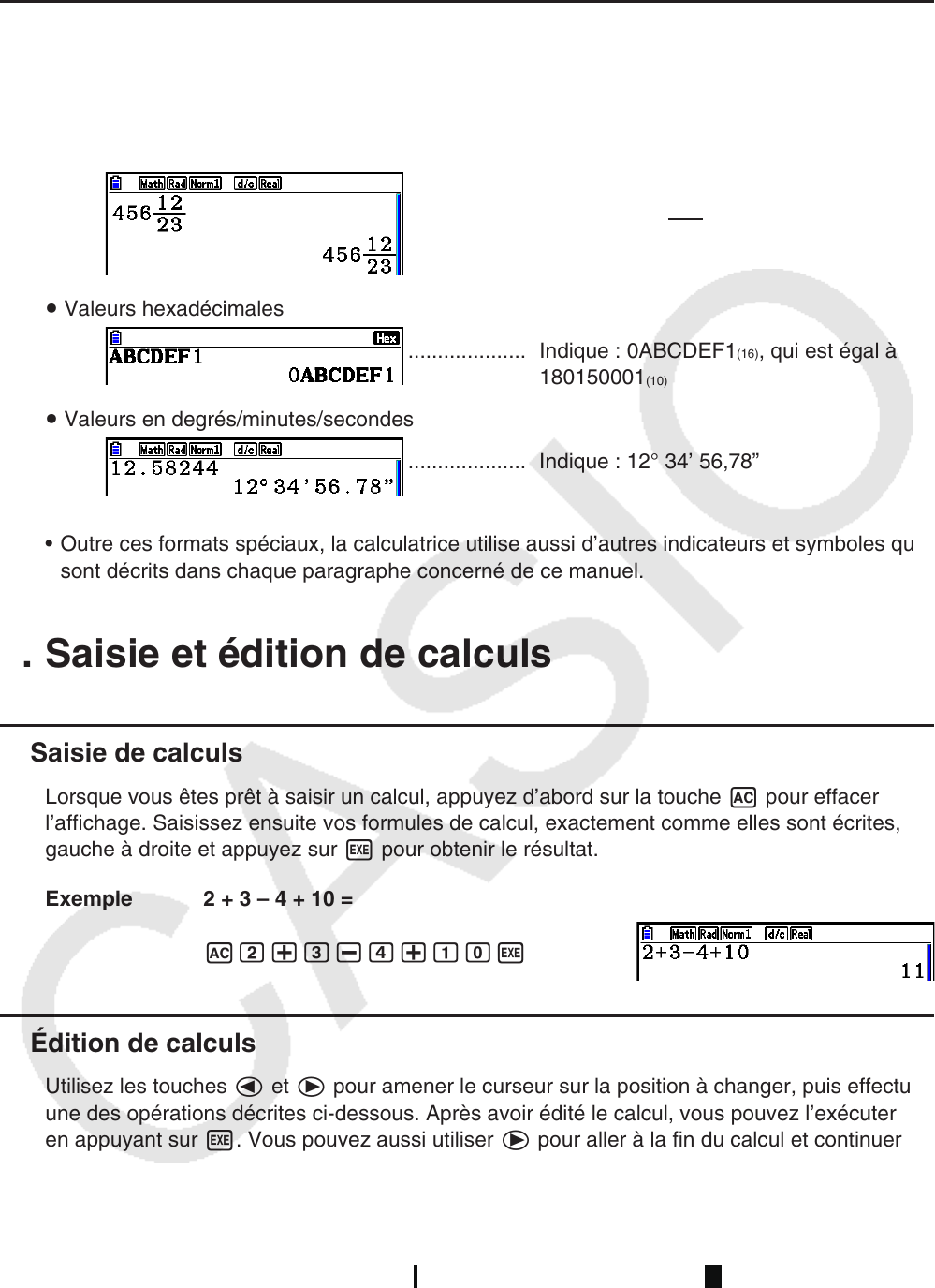 Cette calculatrice emploie des formats d’affichage spéciaux pour indiquer les fractions, les