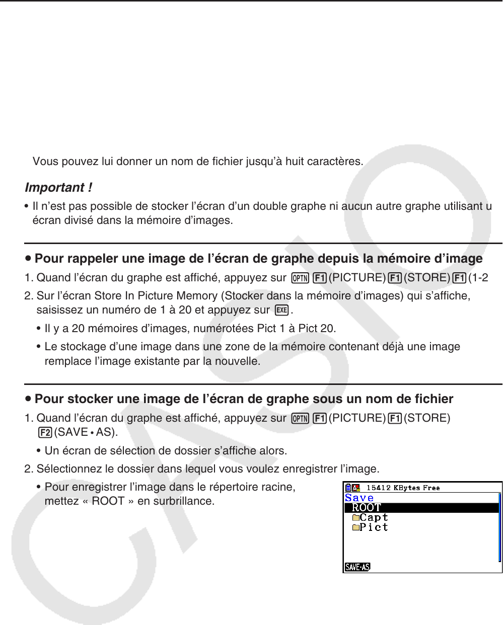 • Il n’est pas possible de stocker l’écran d’un double graphe ni aucun autre graphe utilisant un