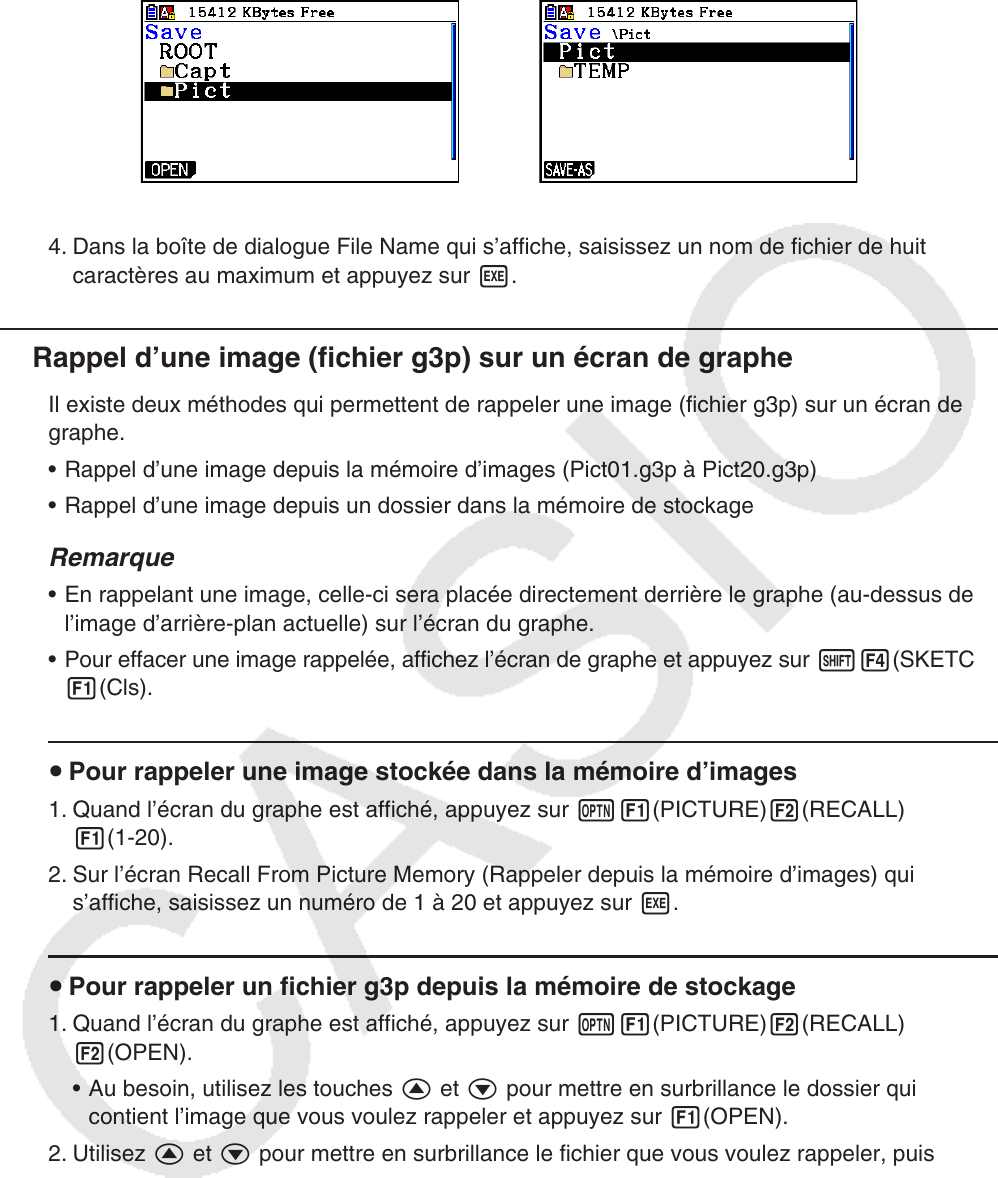 1. Quand l’écran du graphe est affiché, appuyez sur K1(PICTURE) 2(RECALL)