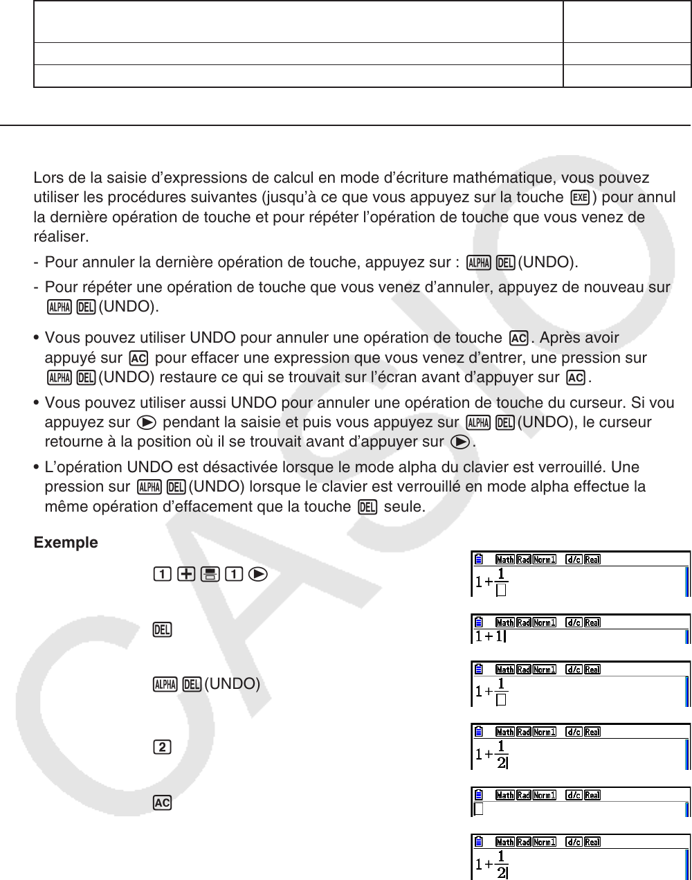 • L’opération UNDO est désactivée lorsque le mode alpha du clavier est verrouillé. Une