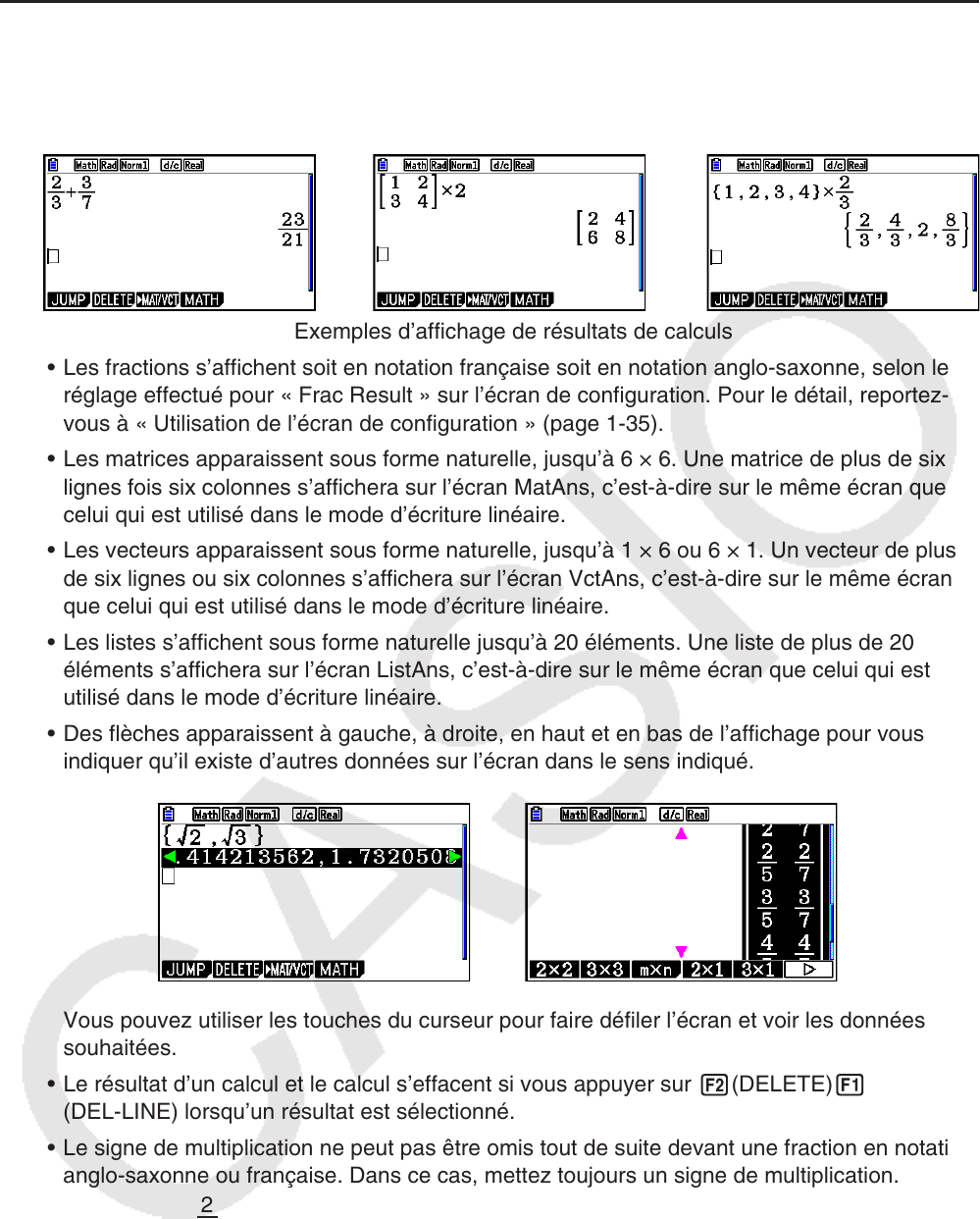 • Le résultat d’un calcul et le calcul s’effacent si vous appuyer sur 2(DELETE) 1