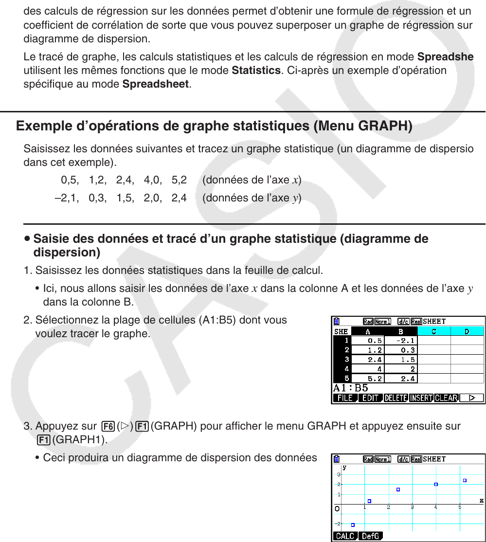 Le tracé de graphe, les calculs statistiques et les calculs de régression en mode Spreadsheet