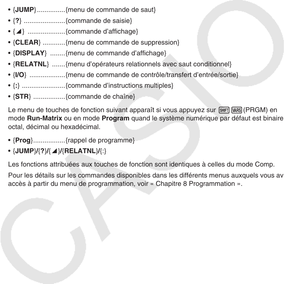Le menu de touches de fonction suivant apparaît si vous appuyez sur !J(PRGM) en