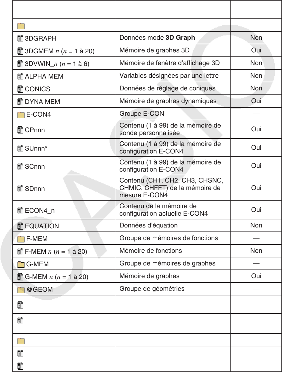 Contenu des mémoires de listes Oui