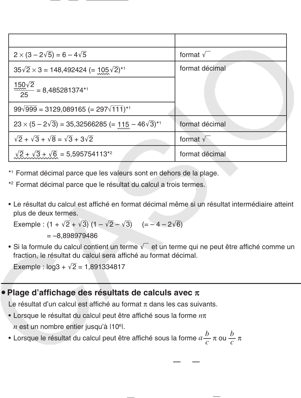 • Le résultat du calcul est affiché en format décimal même si un résultat intermédiaire atteint