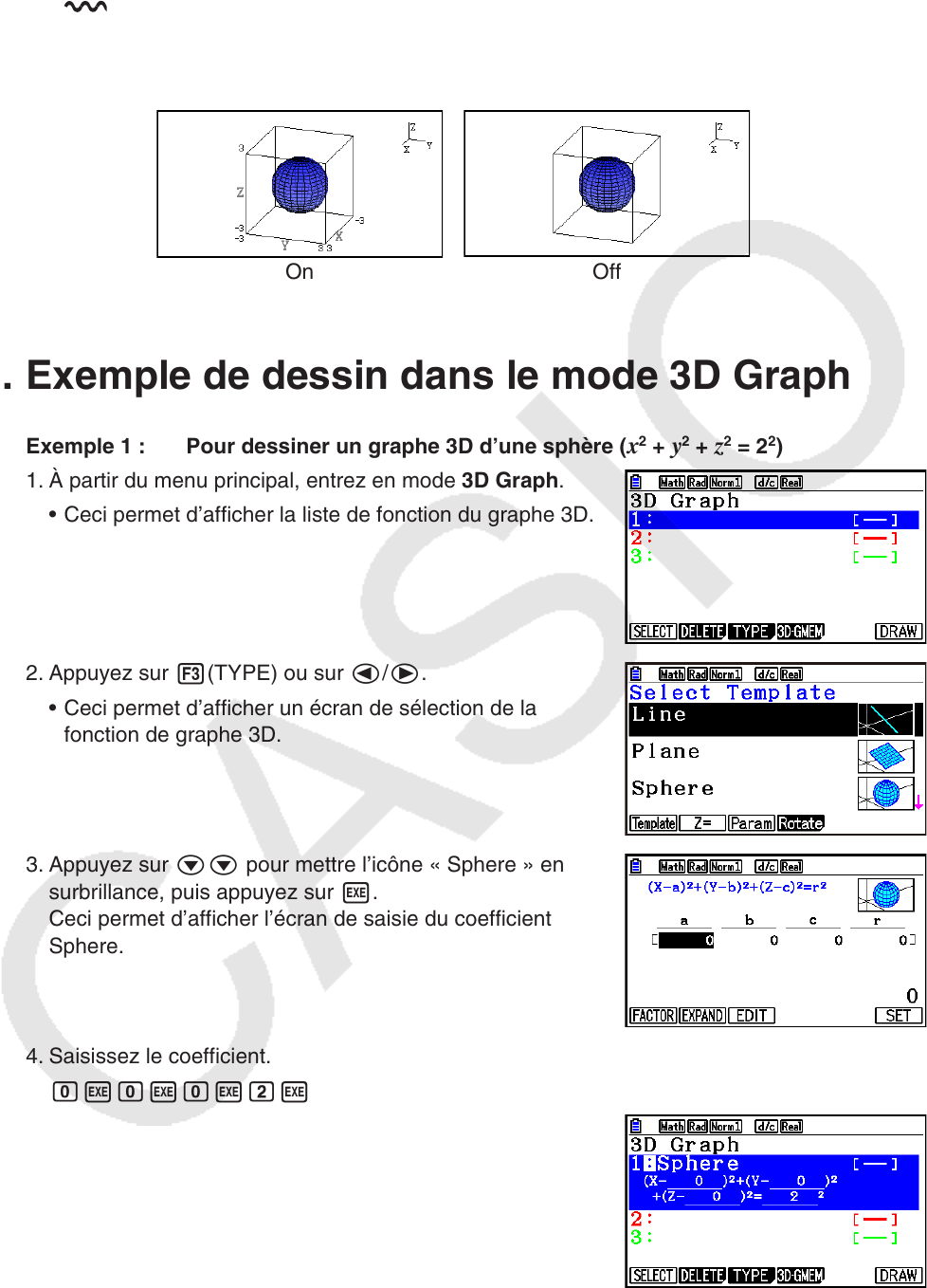 • {On}/{Off} ... {afficher les noms des axes du graphe 3D}/{cacher les noms des axes du