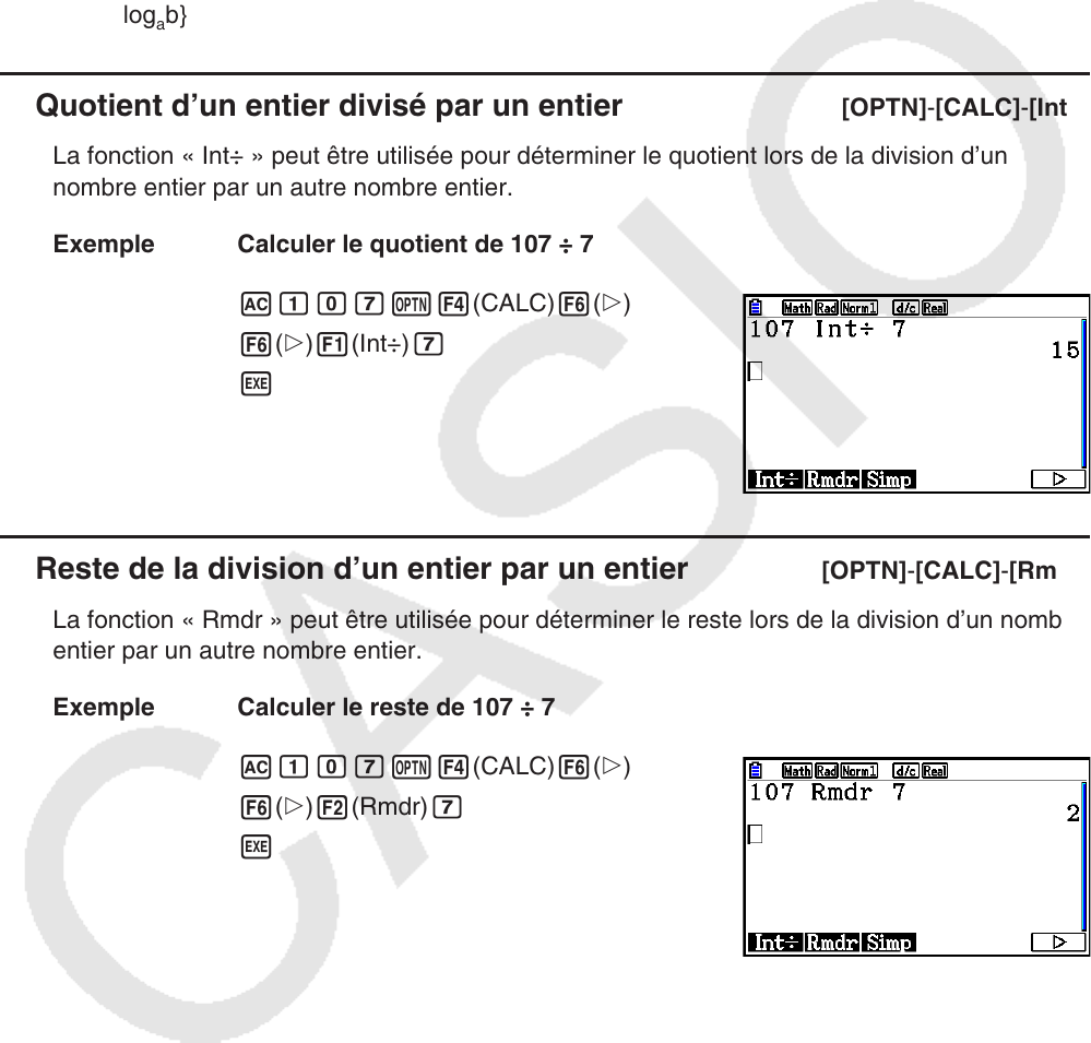 k Quotient d’un entier divisé par un entier   [OPTN]  -  [CALC]  -  [Int÷]