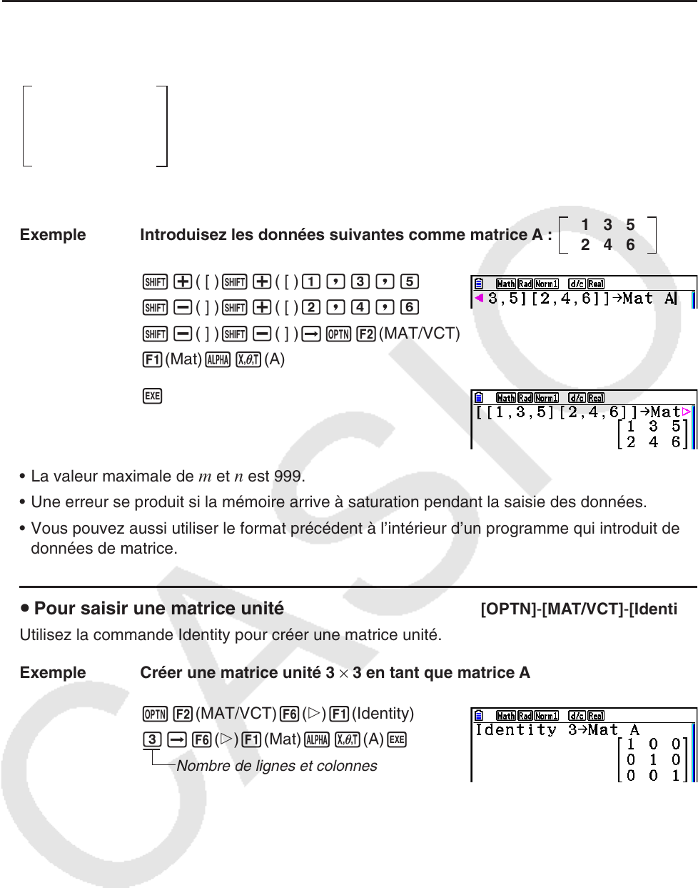 u Pour saisir une matrice unité   [OPTN]  -  [MAT/VCT]  -  [Identity]