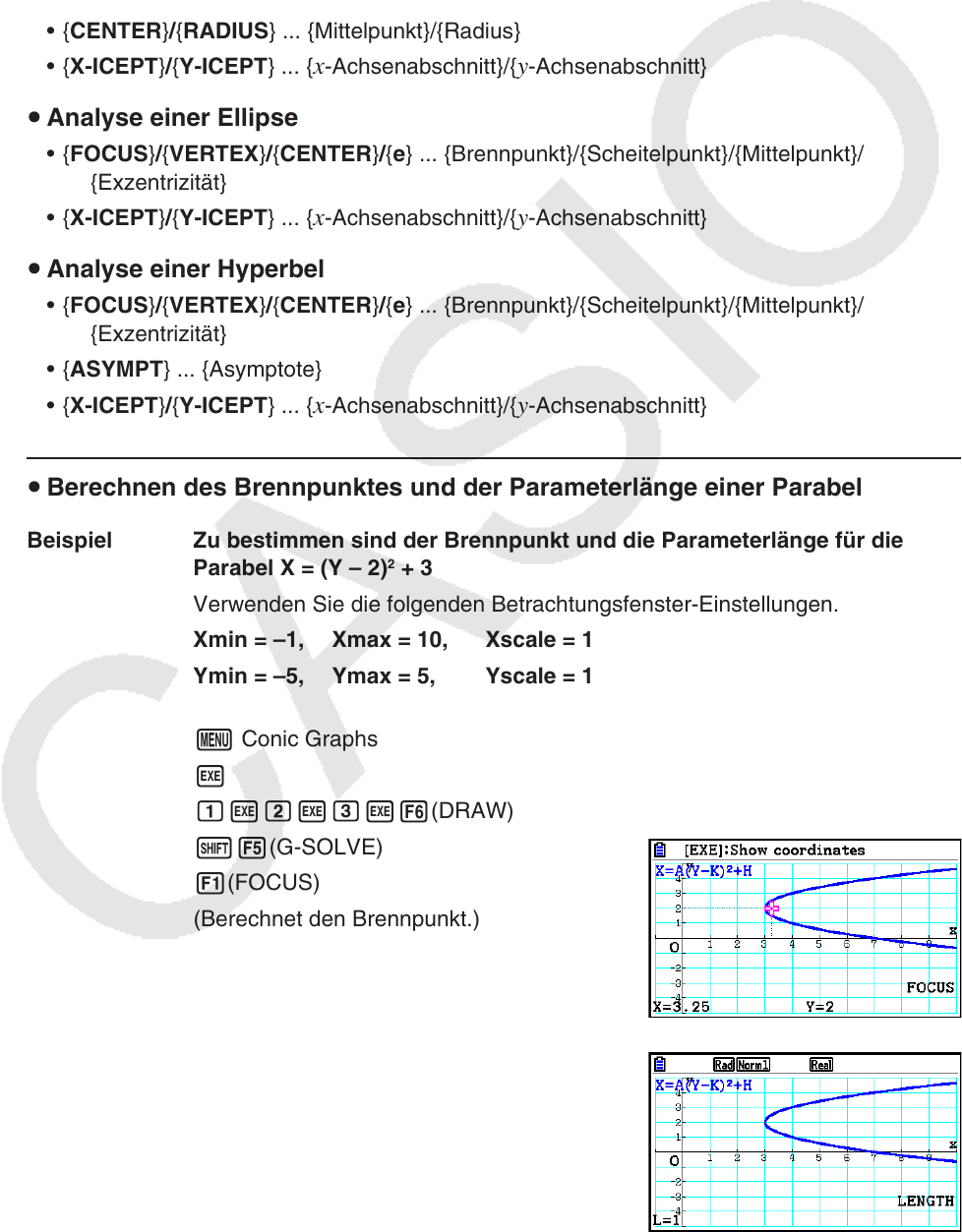 • { FOCUS } / { VERTEX } / { LENGTH } / { e } ... {Brennpunkt}/{Scheitelpunkt}/{Parameterlänge}/