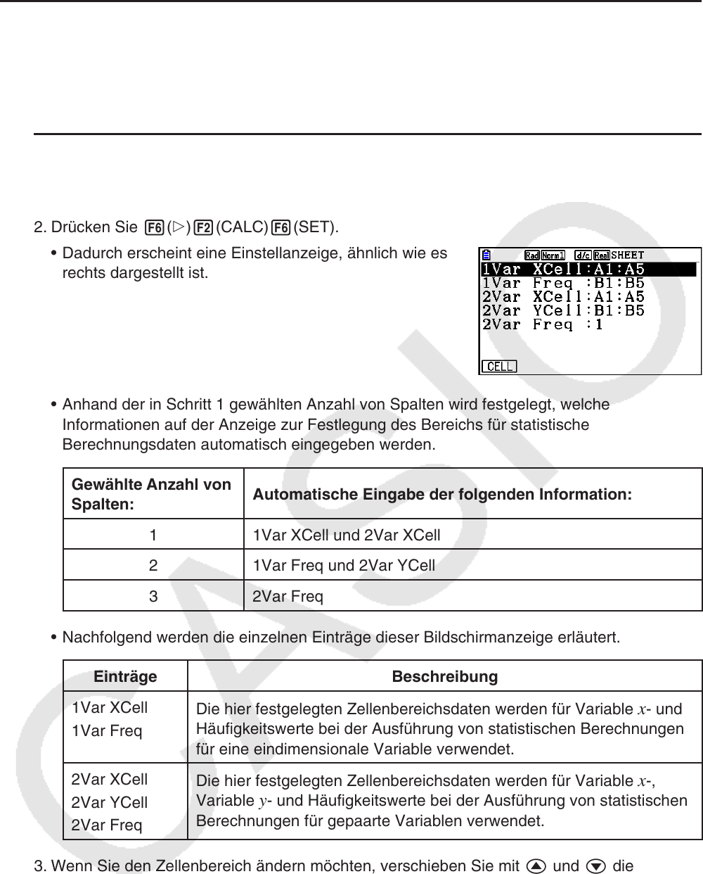 • Um den momentan eingegebenen Zellenbereich zu bearbeiten, drücken Sie 1(CELL)