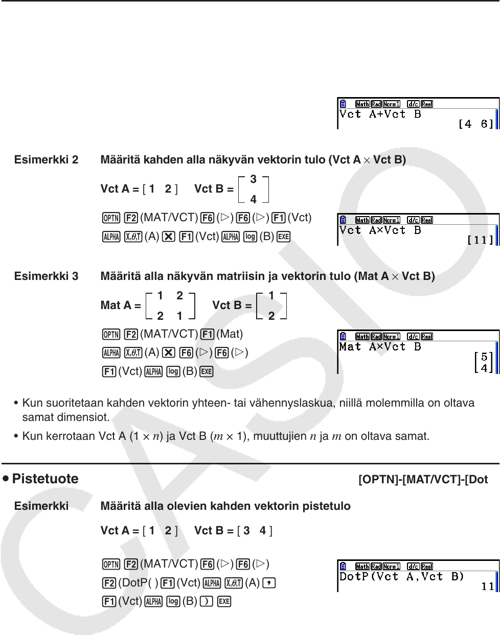 u Vektorien yhteen-, vähennys- ja kertolasku [OPTN]-[MAT/VCT]-[Vct]