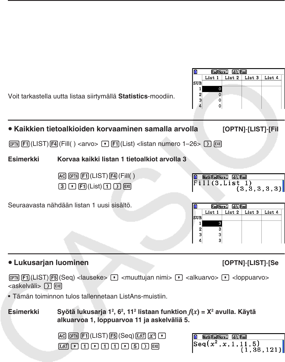 u Kaikkien tietoalkioiden korvaaminen samalla arvolla [OPTN] - [LIST] - [Fill(]