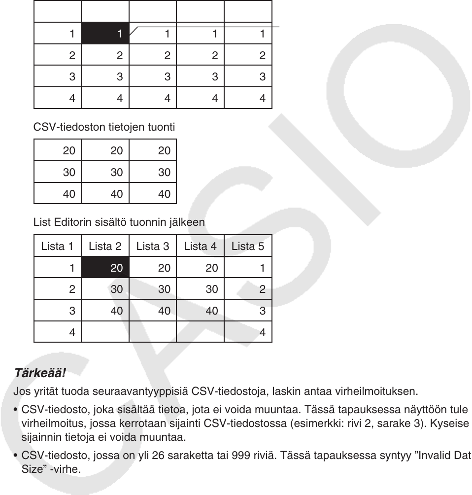Jos yrität tuoda seuraavantyyppisiä CSV-tiedostoja, laskin antaa virheilmoituksen.