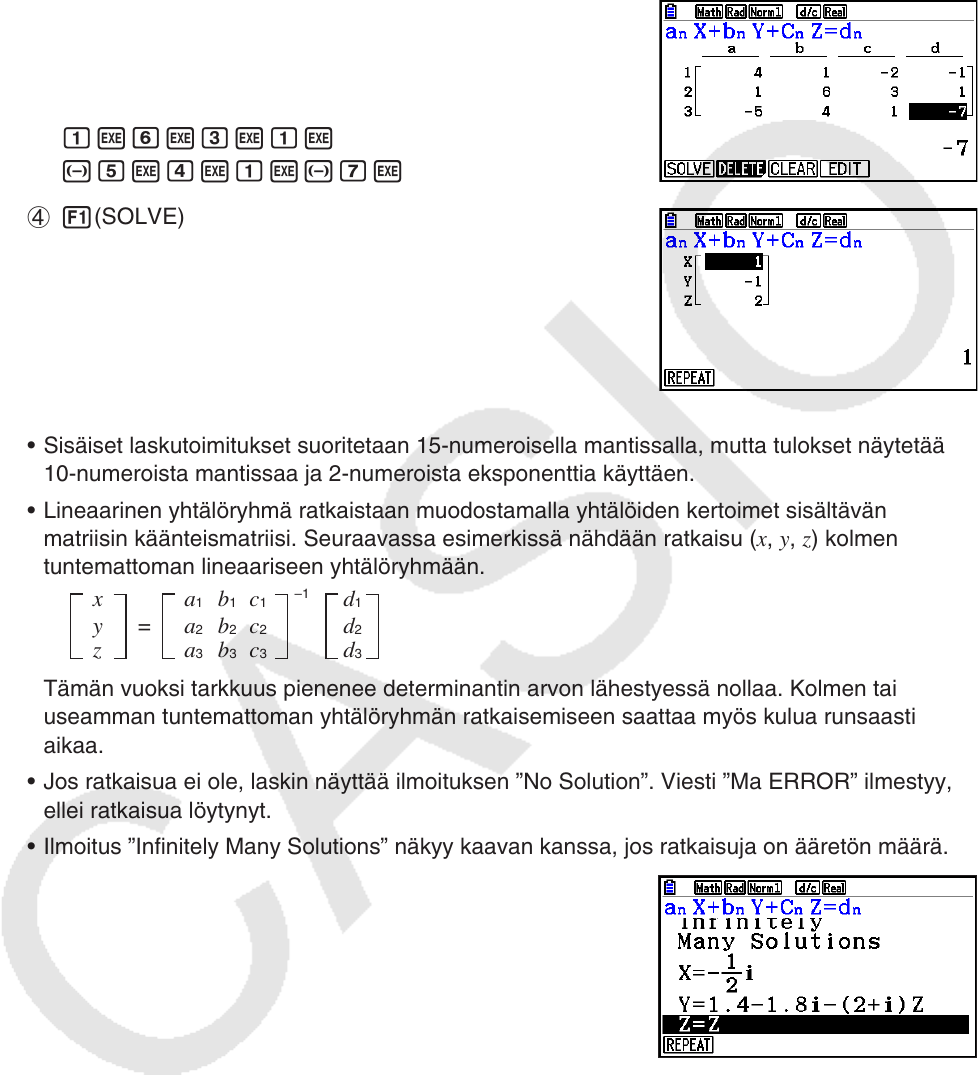 • Jos ratkaisua ei ole, laskin näyttää ilmoituksen ”No Solution”. Viesti ”Ma ERROR” ilmestyy,