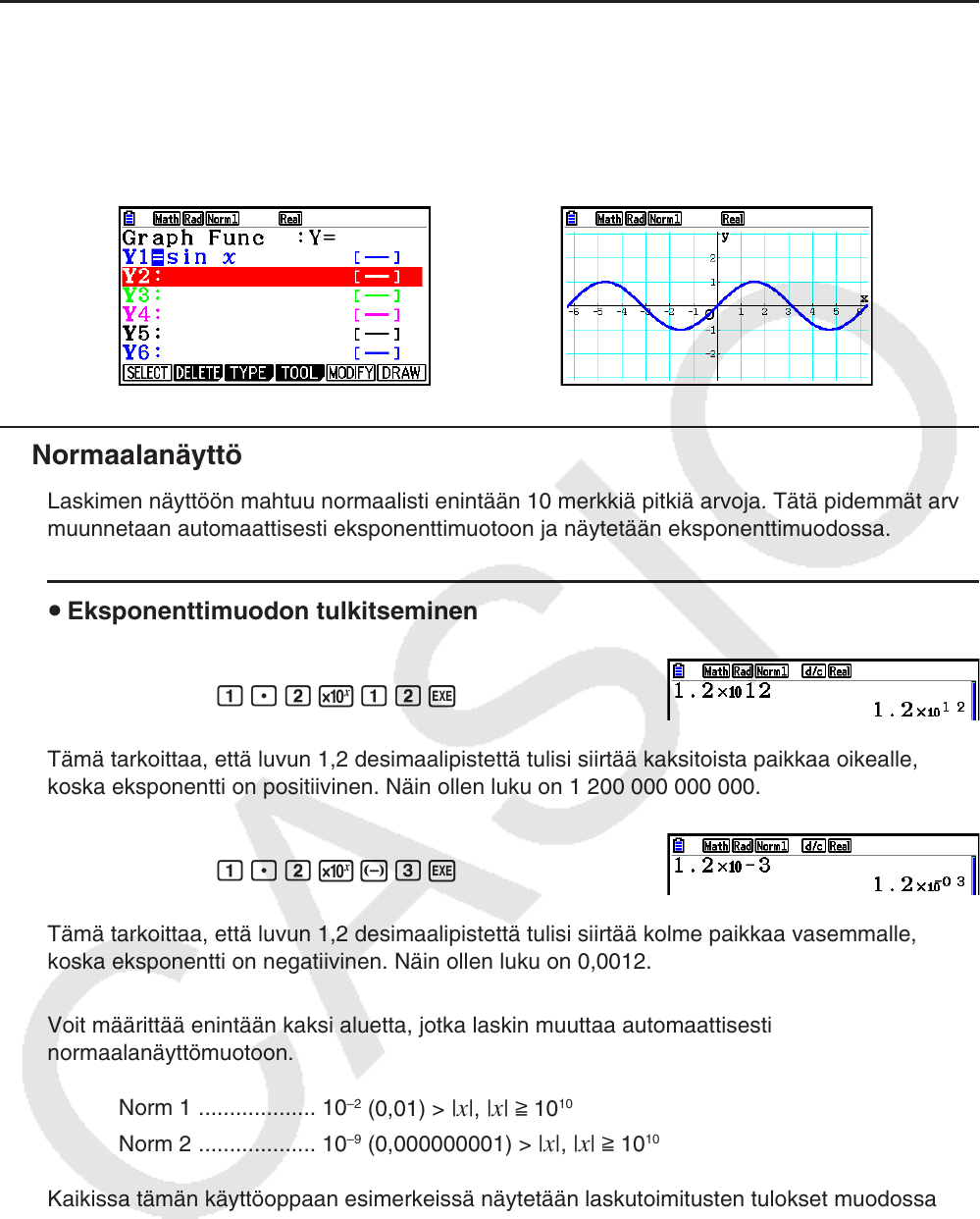 Tässä laskimessa on käytössä kahdenlaisia näyttöjä: tekstinäyttö ja kuvaajanäyttö.