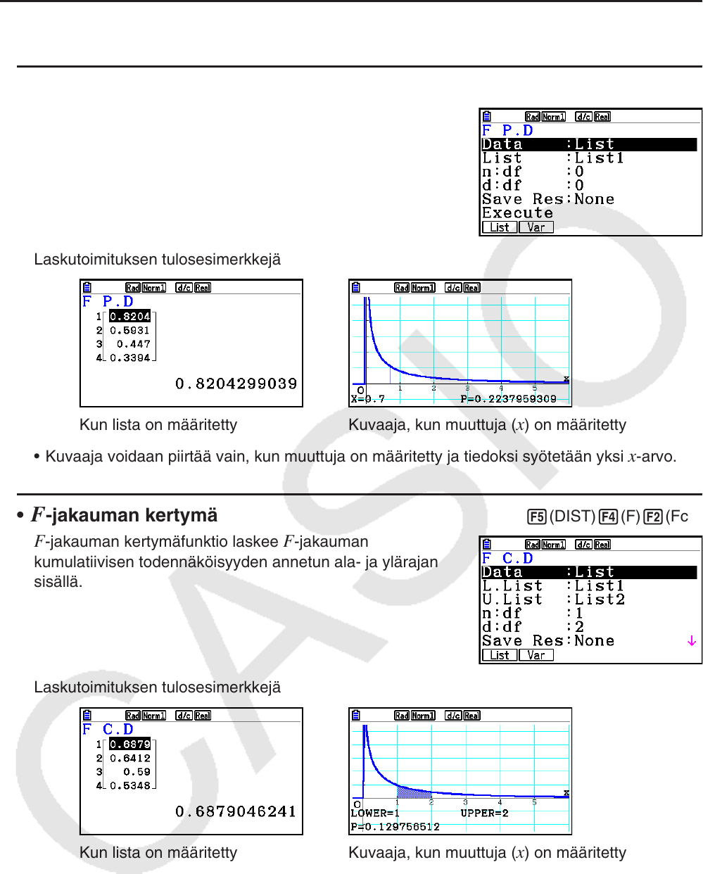 • F -todennäköisyystiheys 5(DIST) 4(F) 1(Fpd)