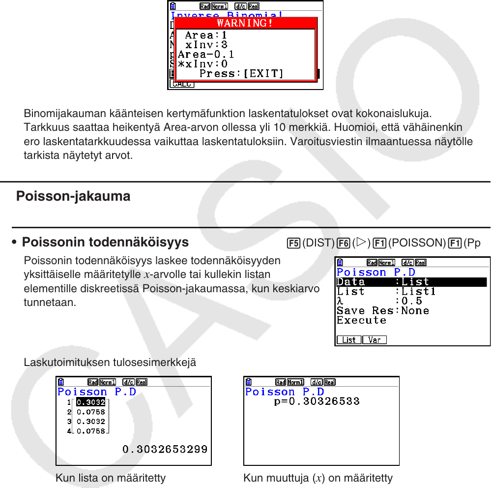 • Poissonin todennäköisyys 5(DIST) 6( g) 1(POISSON) 1(Ppd)