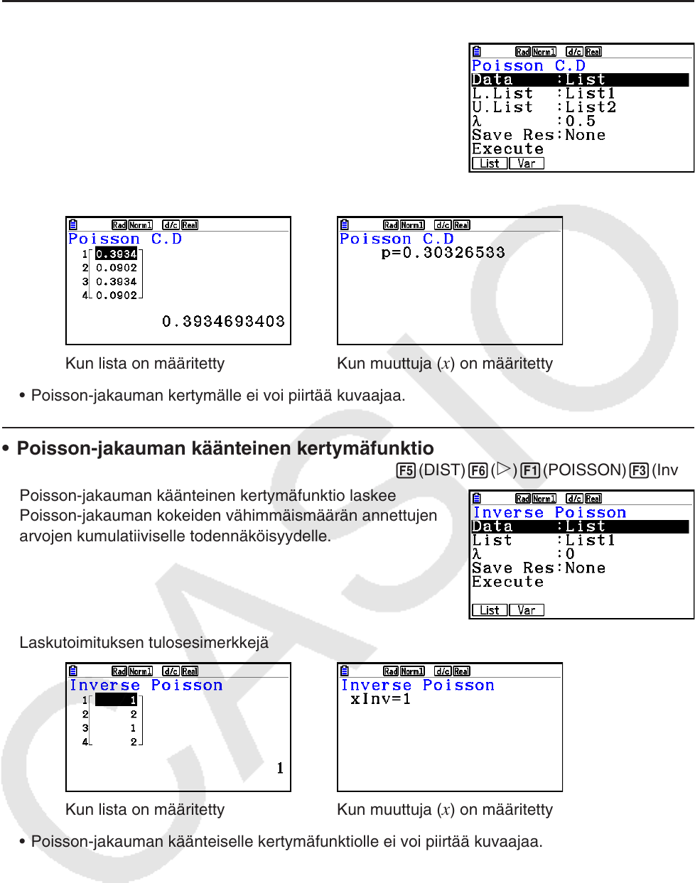 • Poisson-jakauman kertymä 5(DIST) 6( g) 1(POISSON) 2(Pcd)