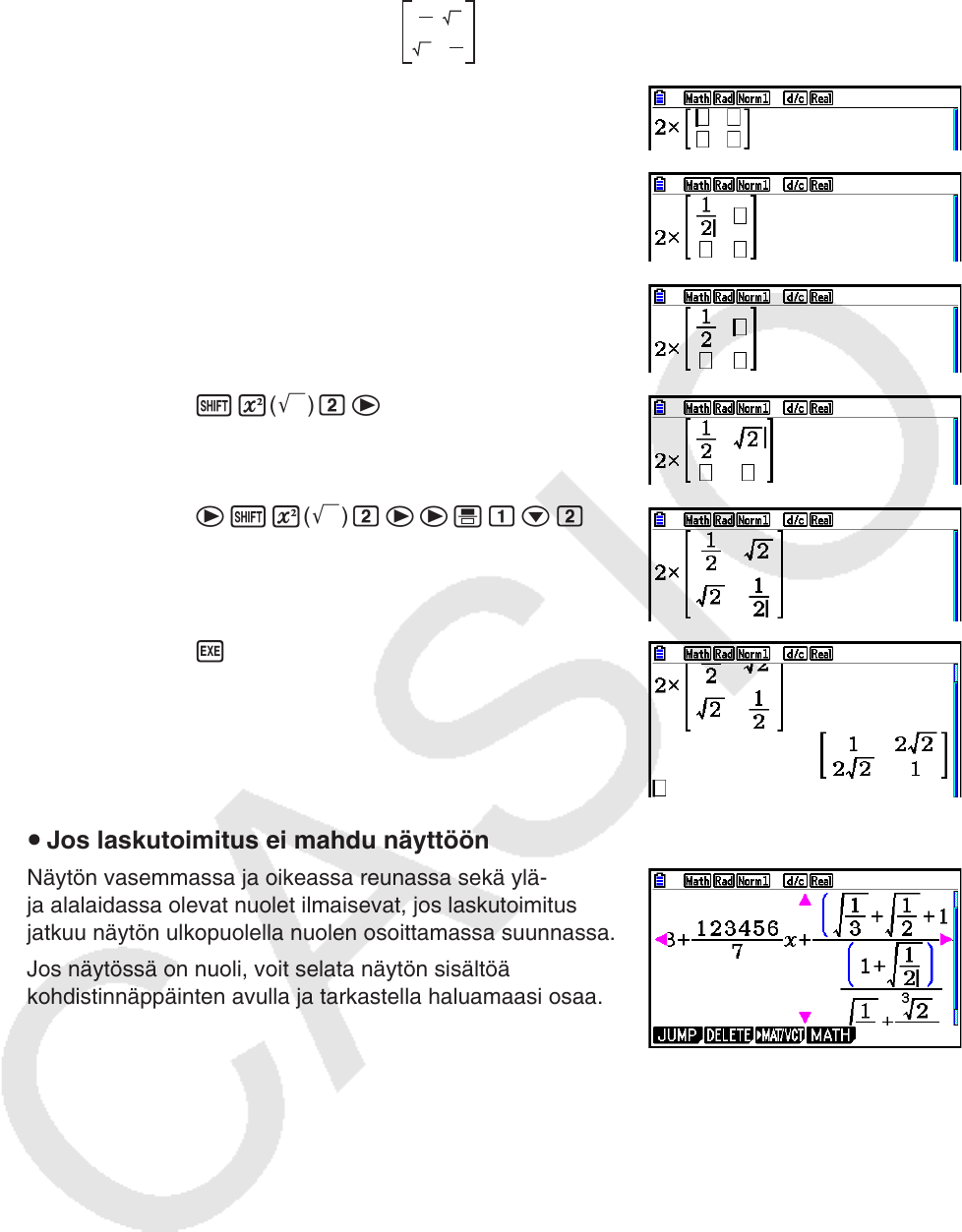 ja alalaidassa olevat nuolet ilmaisevat, jos laskutoimitus