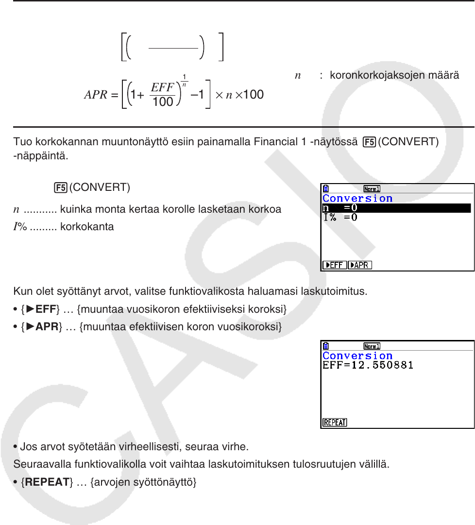 Tuo korkokannan muuntonäyttö esiin painamalla Financial 1 -näytössä 5(CONVERT)