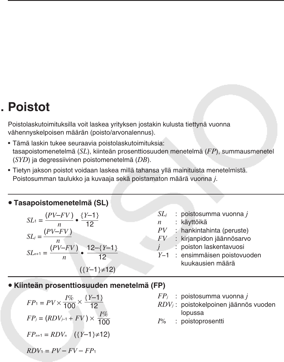 • Tämä laskin tukee seuraavia poistolaskutoimituksia: