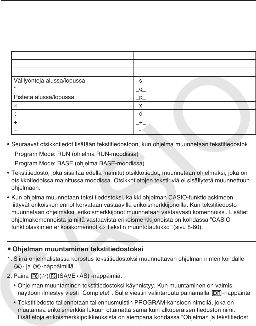 • Kun ohjelma muunnetaan tekstitiedostoksi, kaikki ohjelman CASIO-funktiolaskimeen