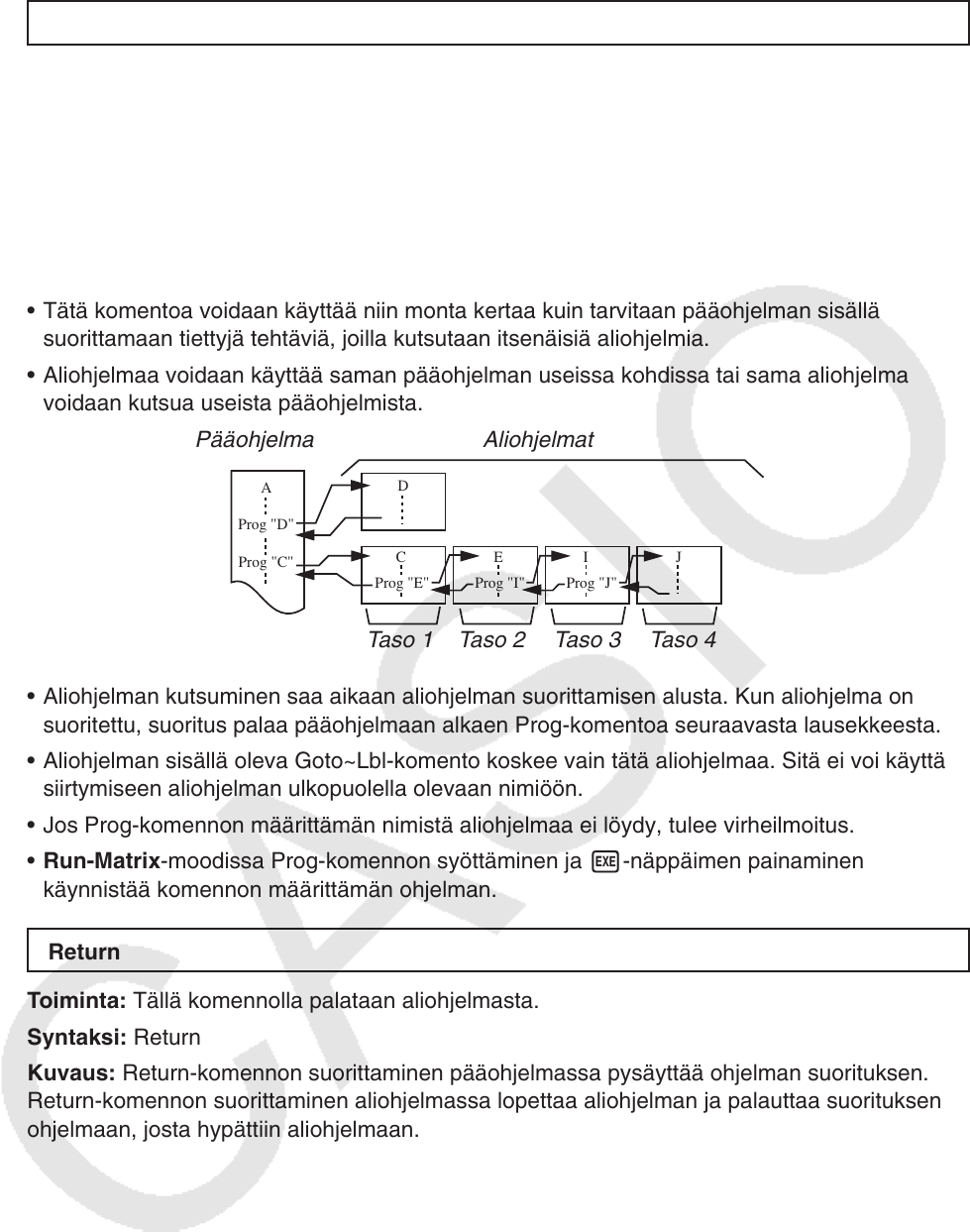 • Aliohjelman sisällä oleva Goto~Lbl-komento koskee vain tätä aliohjelmaa. Sitä ei voi käyttää