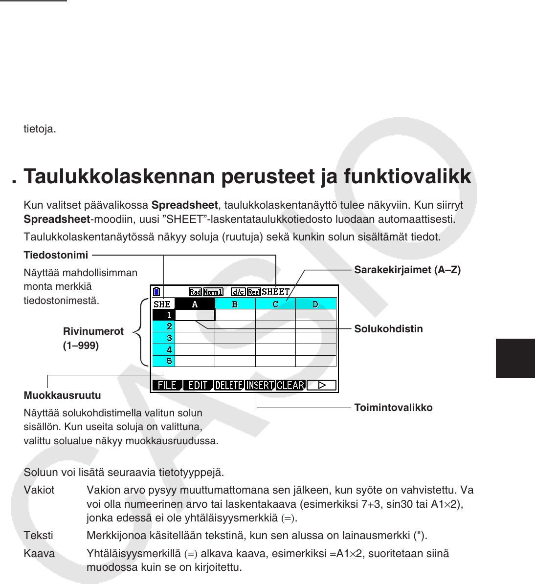 Kaikki tämän osion toiminnot suoritetaan Spreadsheet-moodissa.
