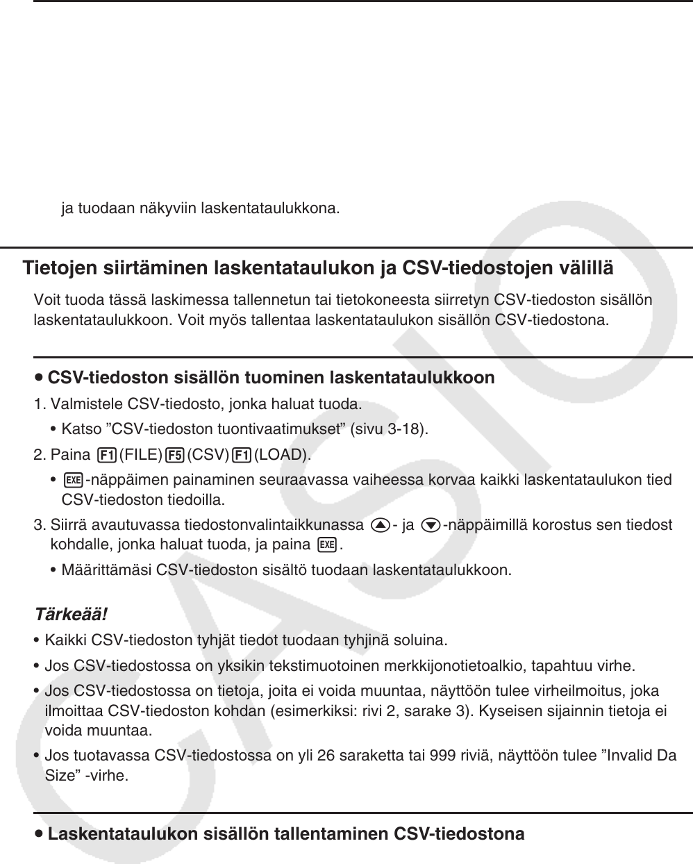 • Jos tuotavassa CSV-tiedostossa on yli 26 saraketta tai 999 riviä, näyttöön tulee ”Invalid Data