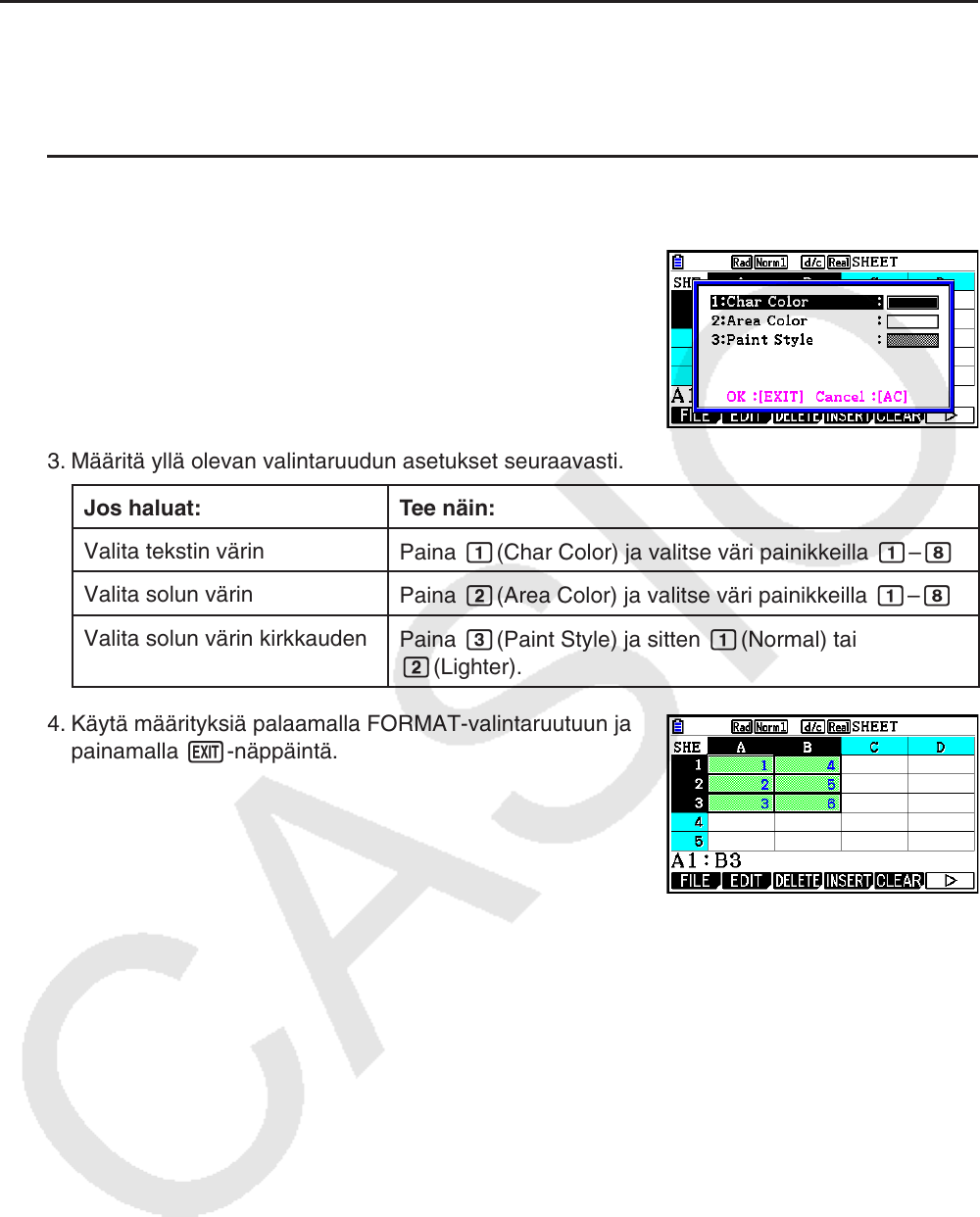 Voit määrittää kunkin solun tekstin värin, solun värin ja solun värin kirkkauden (Normal tai