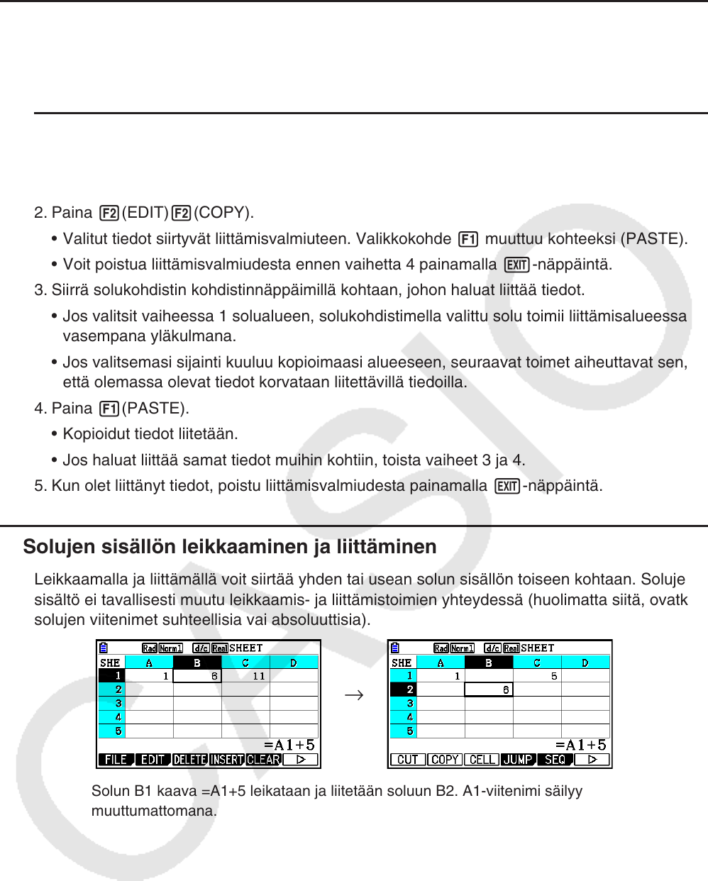 Solun B1 kaava =A1+5 leikataan ja liitetään soluun B2. A1-viitenimi säilyy