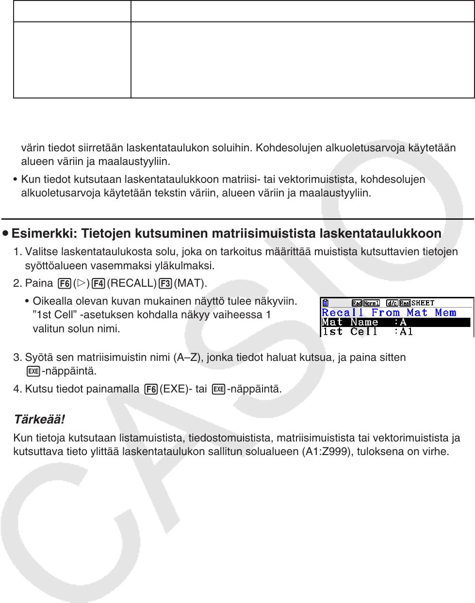 u Esimerkki: Tietojen kutsuminen matriisimuistista laskentataulukkoon