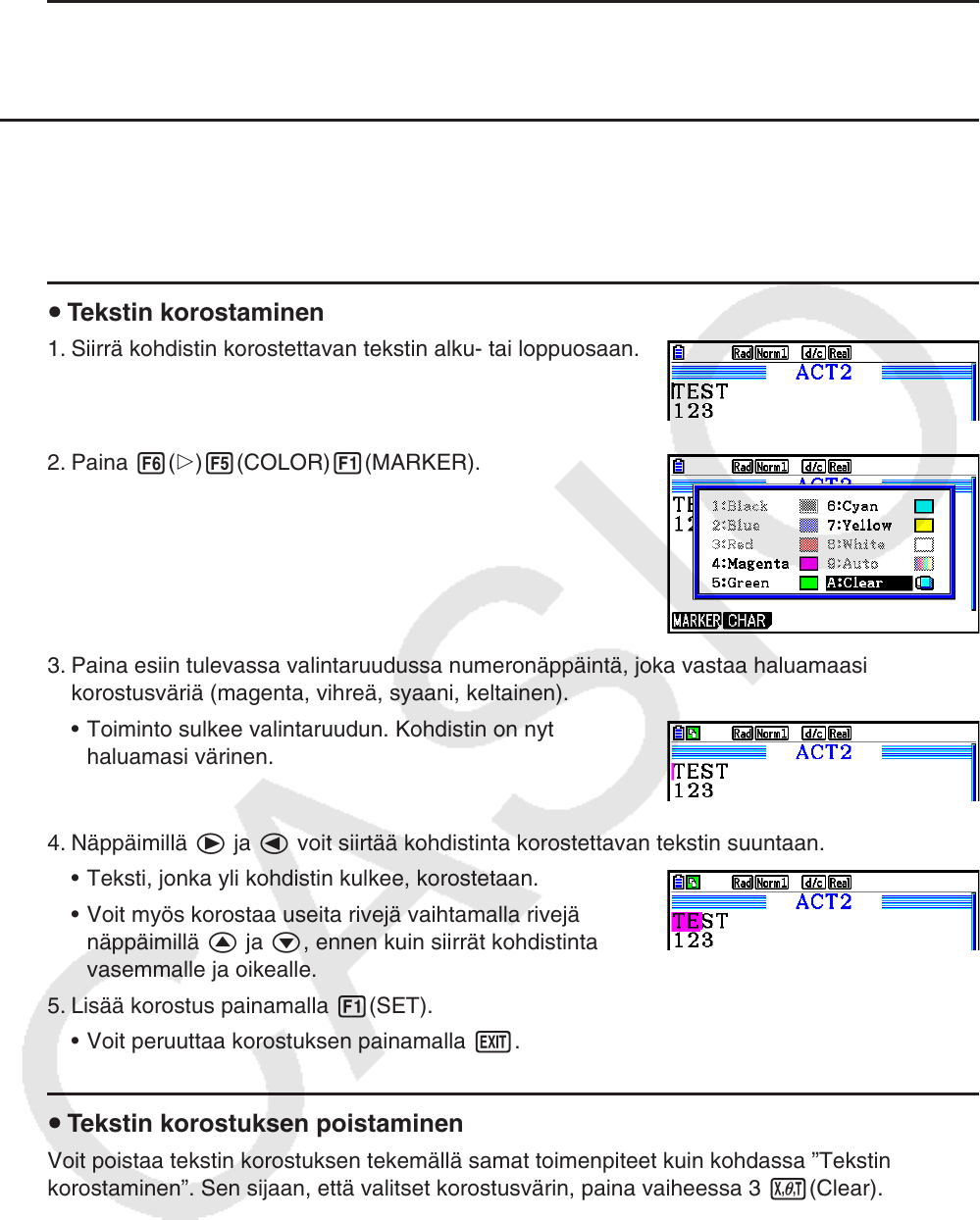 korostaminen”. Sen sijaan, että valitset korostusvärin, paina vaiheessa 3 v(Clear).