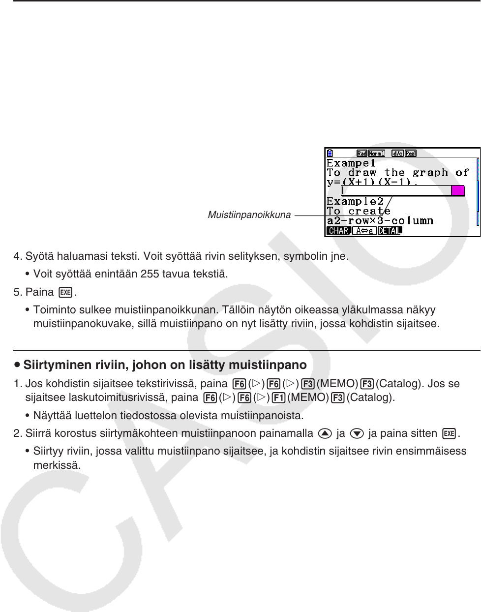 1. Jos kohdistin sijaitsee tekstirivissä, paina 6( g) 6( g) 3(MEMO) 3(Catalog). Jos se
