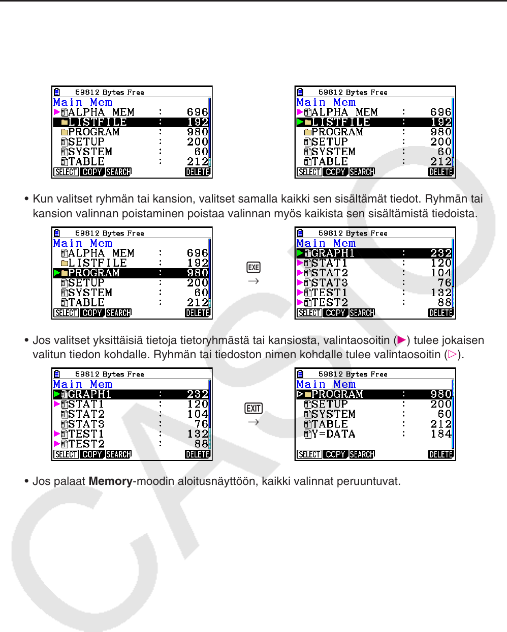 ( ). Jos painat 1(SELECT) -näppäintä uudestaan, tietoa ei valita ja valintaosoitin katoaa.