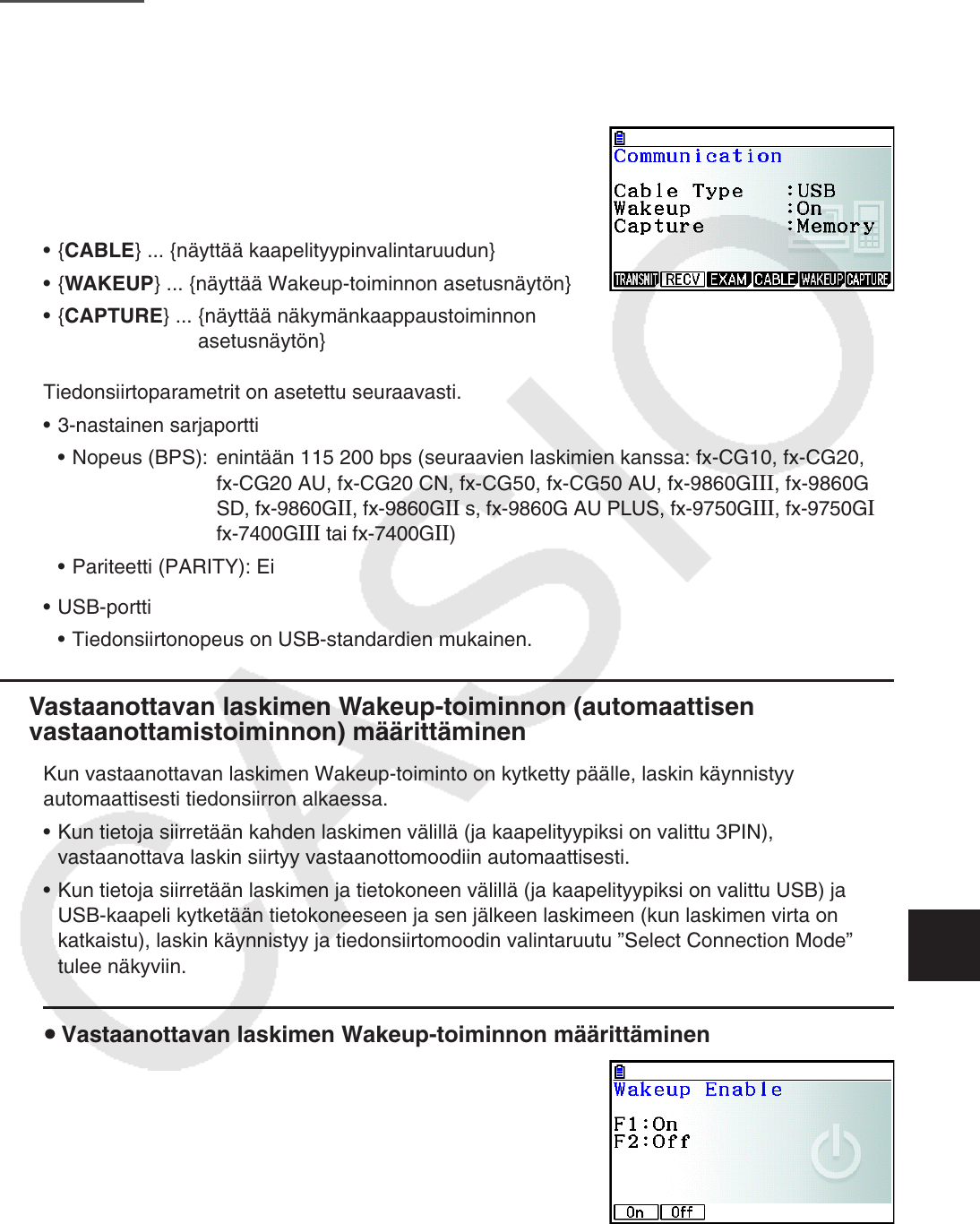 • Nopeus (BPS): enintään 115 200 bps (seuraavien laskimien kanssa: fx-CG10, fx-CG20,