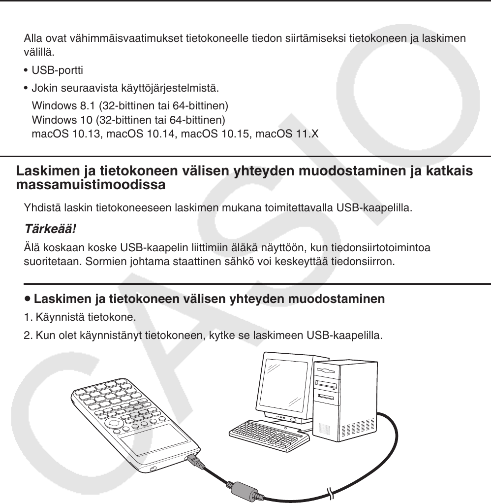 Kun laskin ja tietokone yhdistetään USB-kaapelilla, tietokone havaitsee laskimen