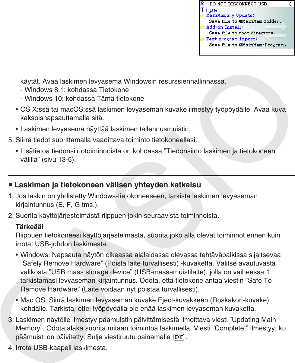 • Lisätietoa tiedonsiirtotoiminnoista on kohdassa ”Tiedonsiirto laskimen ja tietokoneen