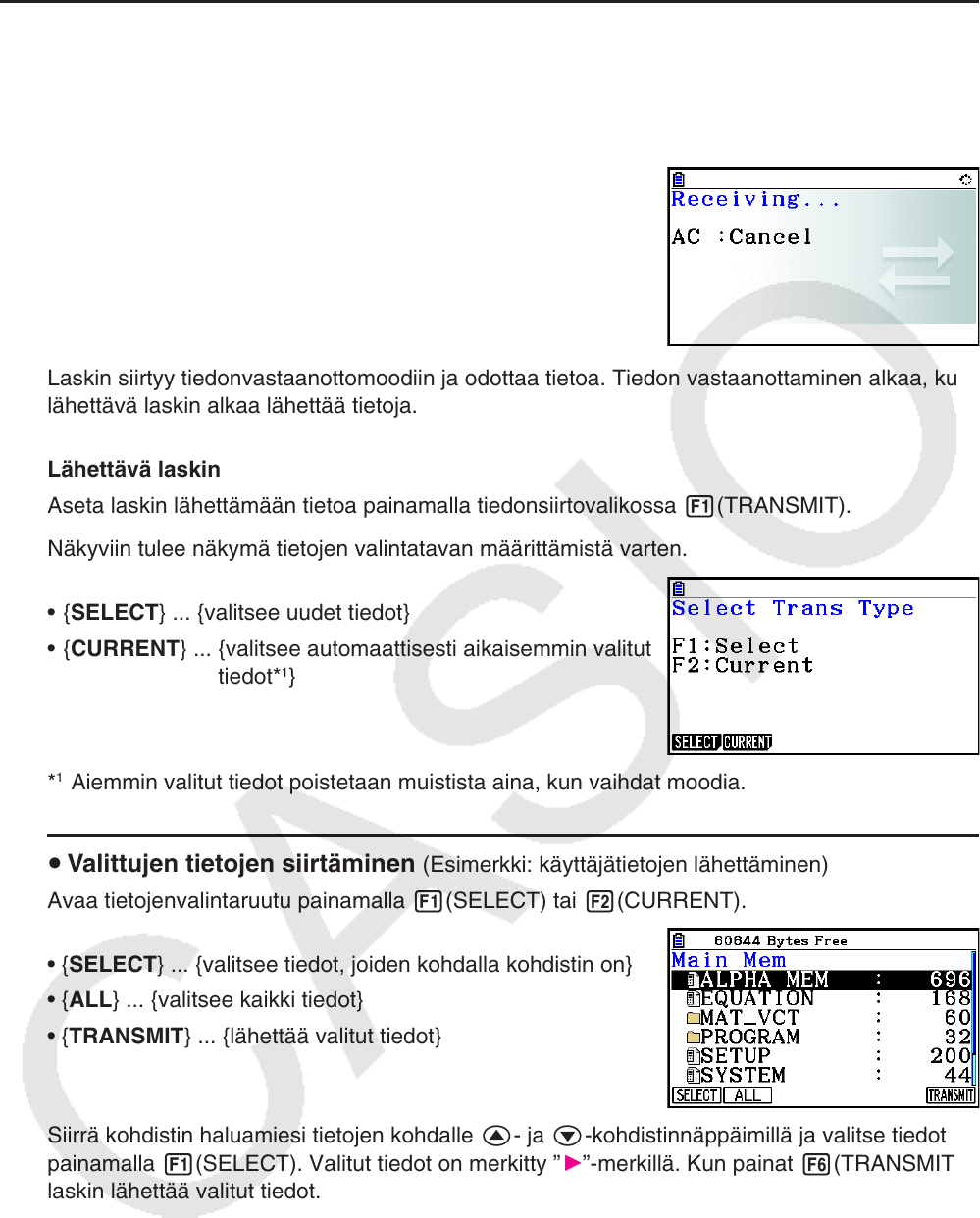 • { TRANSMIT } ... {lähettää valitut tiedot}