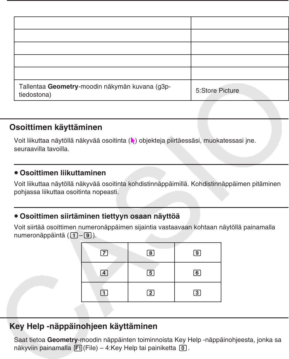 Saat tietoa Geometry-moodin näppäinten toiminnoista Key Help -näppäinohjeesta, jonka saat