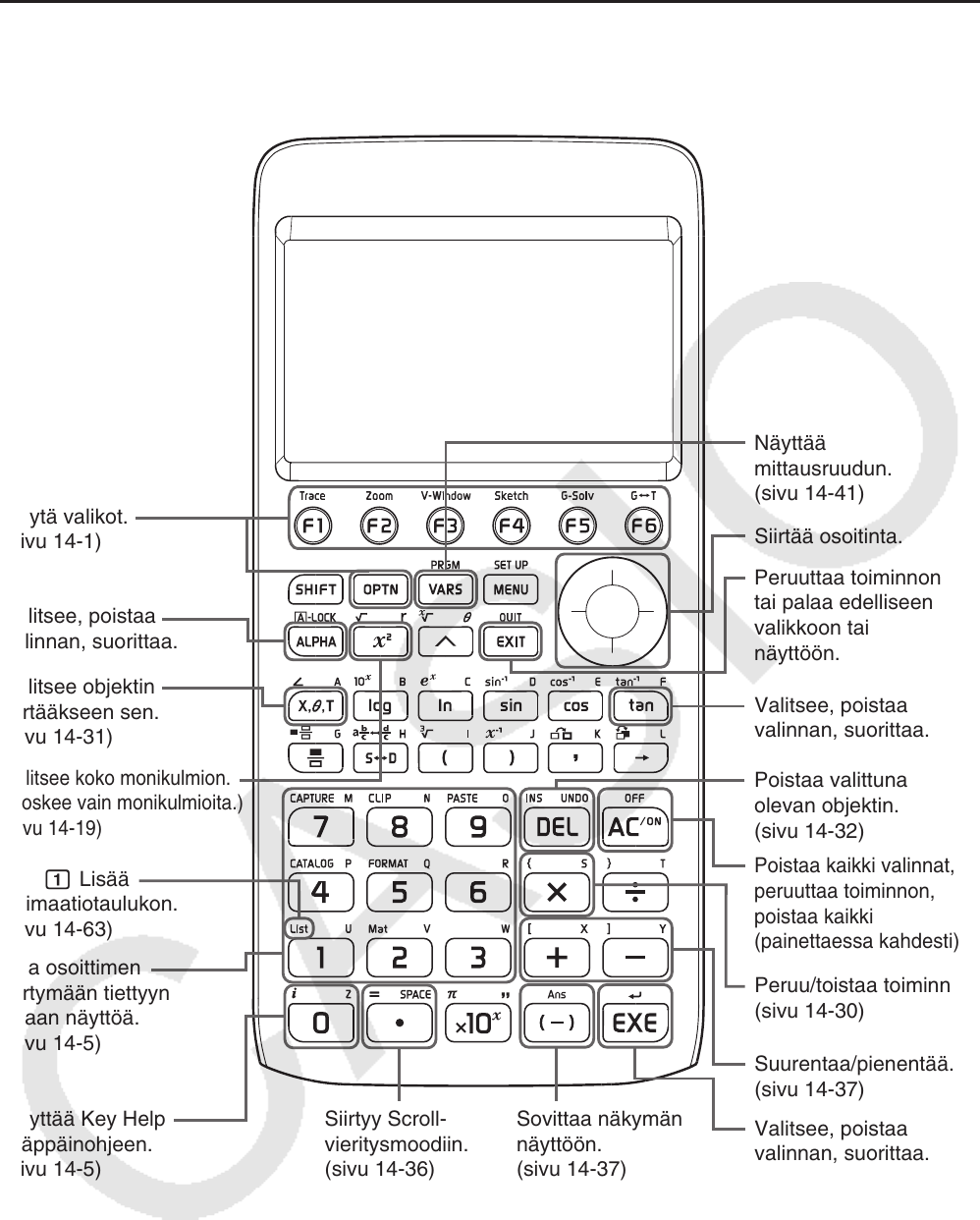 Alla olevassa kuvassa esitetään näppäimet, joita käytetään Geometry-moodin piirtonäkymän