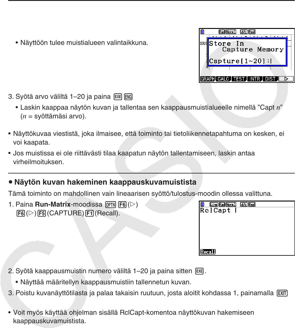 • Laskin kaappaa näytön kuvan ja tallentaa sen kaappausmuistialueelle nimellä ”Capt