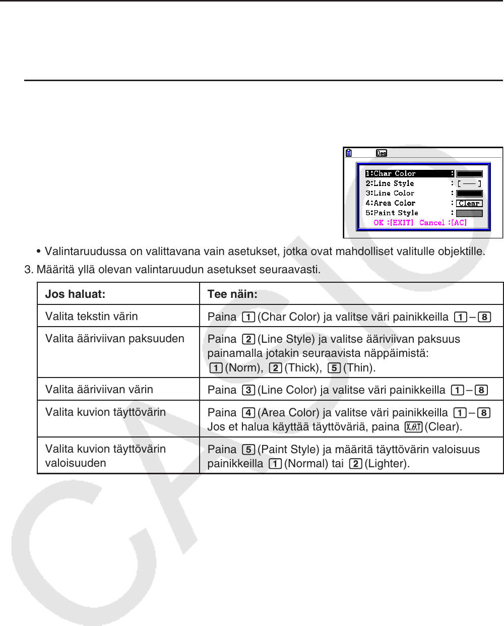 • Valintaruudussa on valittavana vain asetukset, jotka ovat mahdolliset valitulle objektille.